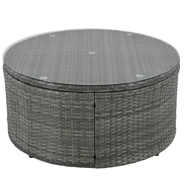 9-Piece Gray Rattan Wicker Outdoor Sectional Set with Beige Cushions and Pillows and Tempered Glass Coffee Table