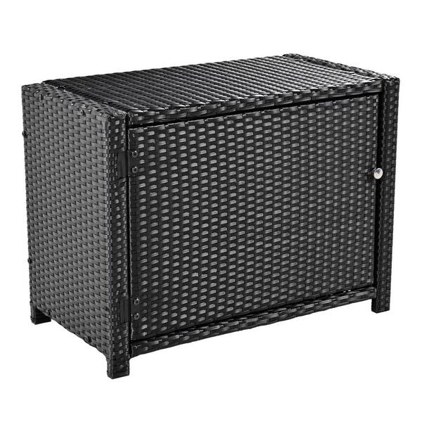 Black Wicker Outdoor Sectional with Beige Cushions and Storage Spaces