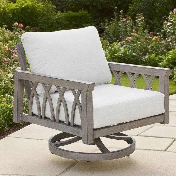 Grey Aluminum Outdoor Couch with Beige Cushions and Swivel Seat
