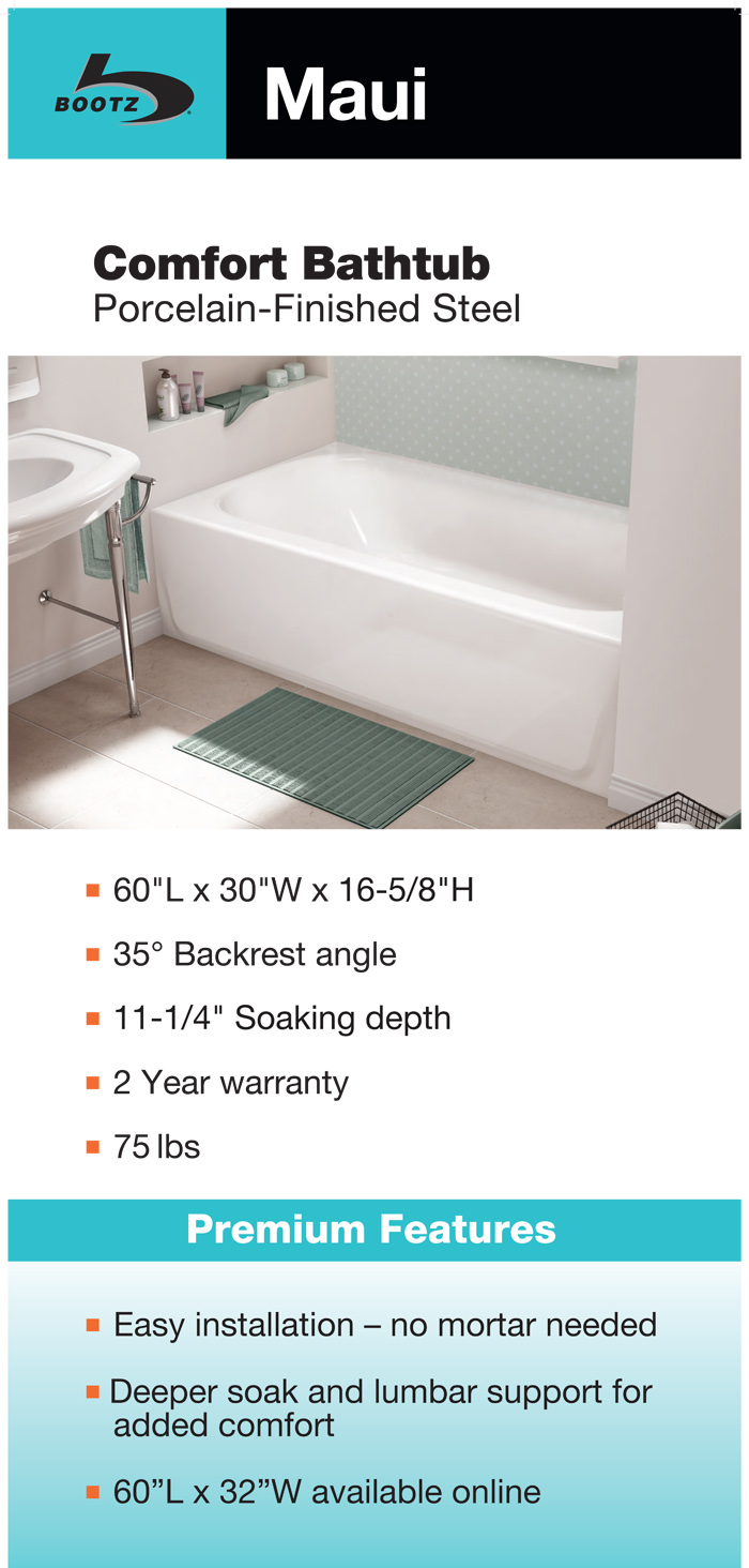 The Maui 60 in. bath tub is the industry's deepest enameled steel bath tub with a modern, functional recess design. The Maui is lightweight and offers a built in leveling support pad. No mortar base required for installation- just set and level it, saving time and money. The Maui offers a 35 degree lumbar support for a more comfortable bathing experience.