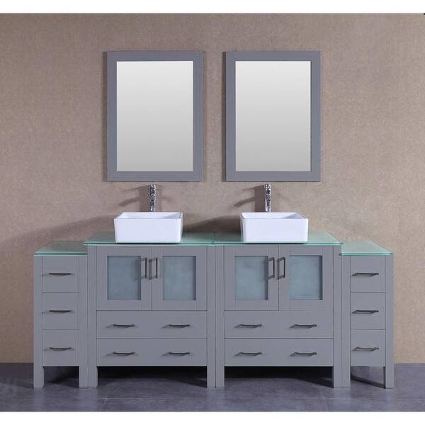 84 in. Double Vanity in Gray with Tempered Glass Vanity Top in Green with White Basin Polished Chrome Faucet and Mirror