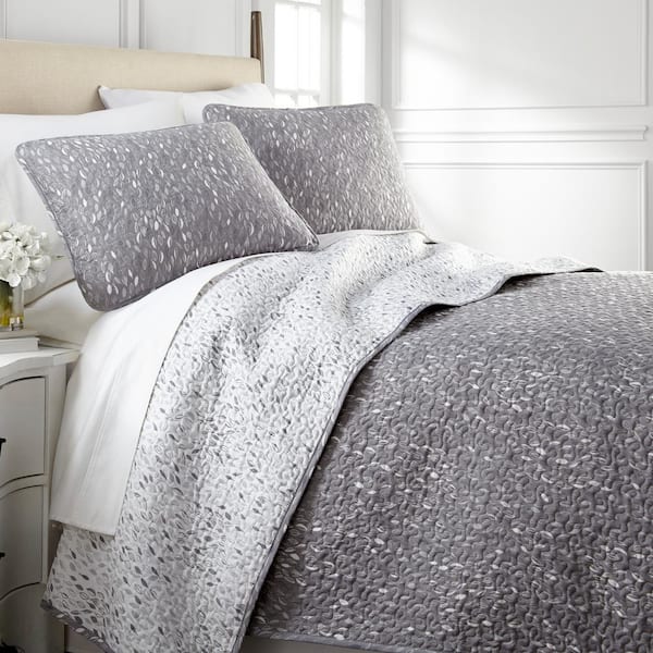 Botanical Leaves Grey Reversible Microfiber King Quilt Set