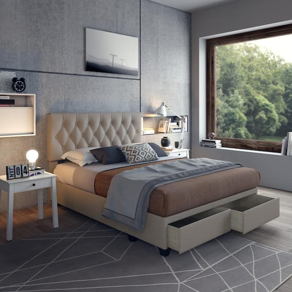 Salerno Linen Upholstered Tufted Platform Storage Bed Frame, Queen, Beige