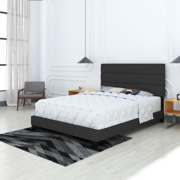 Sicily Upholstered Linen Tri Panel Platform Bed Frame with Headboard, Queen, Black