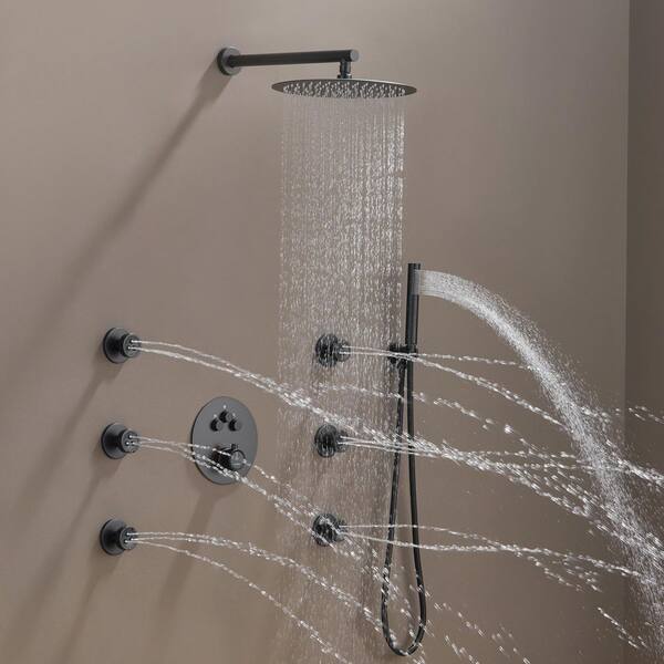 1-Spray 12 in. Thermostatic Dual Shower Head and Handheld Shower Head 2.5 GPM Wall Mount w/ Body Sprayer in Matte Black