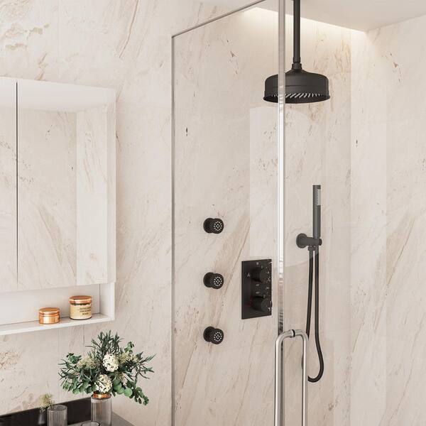 1-Spray 8 in. Round Dual Shower Head Thermostatic Ceiling Mount Fixed and Handheld Shower Head 2.5 GPM in Matte Black