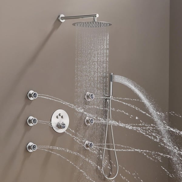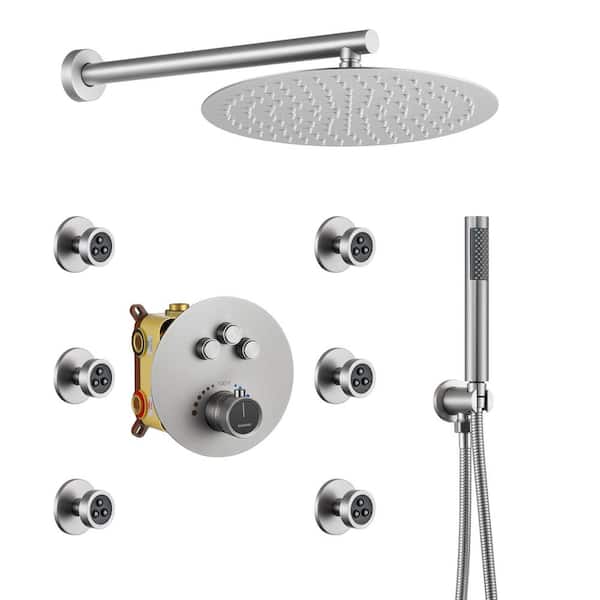 1-Spray Thermostatic Dual Shower Head and Handheld Shower Head 1.8 GPM Wall Mount with Body Sprayer in Brushed Nickel