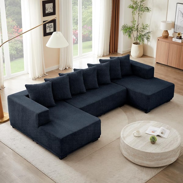 128 in. Wide Straight Arm Chenille U-Shaped Minimalist Style Modular Sectional Sofa Set in. Blue with Supporting Foot