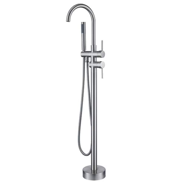 2-Handle Floor Mount Freestanding Tub Faucet with Hand Shower and Water Supply Hoses in Brushed Nickel