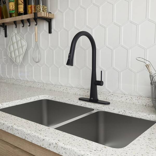 2-Spray Patterns Single Handle Pull Down Sprayer Kitchen Faucet with Deckplate and Water Supply Hoses in Matte Black