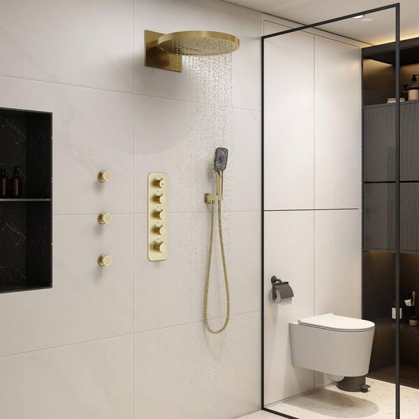 3-Spray Thermostatic Dual Shower Head Wall Mount Fixed and Handheld Shower Head 2.5 GPM with Body Spray in Brushed GOld