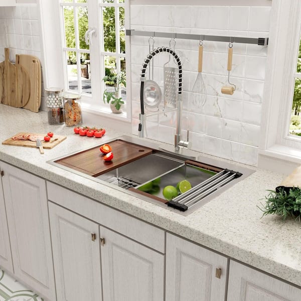 31 in. Drop-in Single Bowl 18-Gauge Brushed Stainless Steel Kitchen Sink with Pull Out Faucet with Accessories