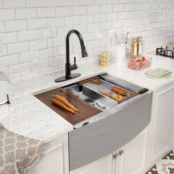 31 in. Farmhouse/Apron-Front Single Bowl 18 Gauge Brushed Stainless Steel Kitchen Sink with Pull-Down Faucet
