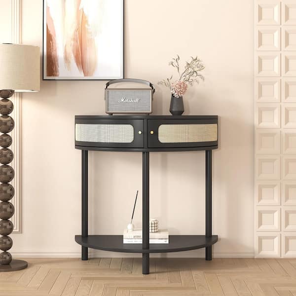 32.3 in. Tall Black Unique Half Moon Design MDF Console Table with 2 Rattan Storage Cabinet and Bottom Shelf