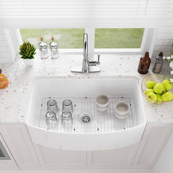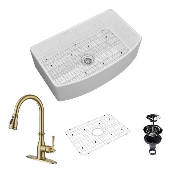 33 in. Farmhouse/Apron-Front Single Bowl Fireclay Kitchen Sink with Brushed Gold Faucet, Bottom Grid and Strainer Basket