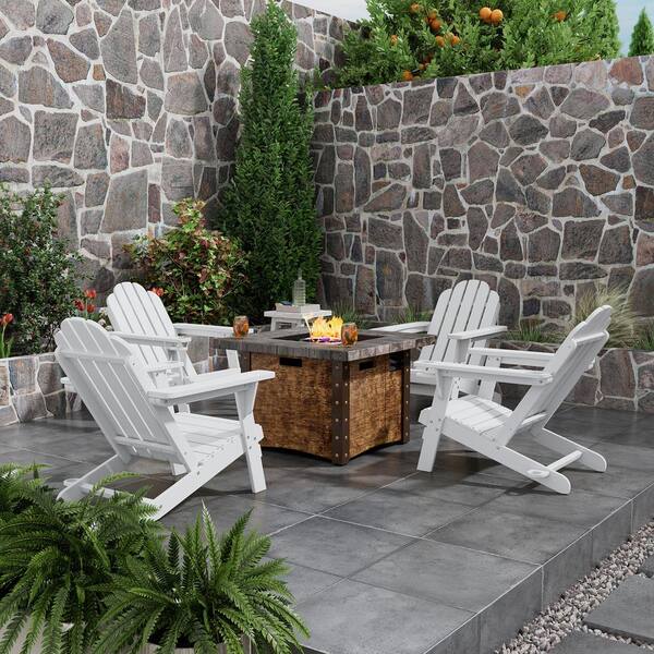 34.5 in. Square Gas Metal Fire Pit with 5 Back Panel Fixed Outdoor Adirondack Chair in White