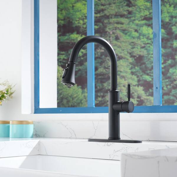 4-Spray Patterns Single Handle Pull Down Sprayer Kitchen Faucet with Deckplate and Water Supply Hoses in Matte Black