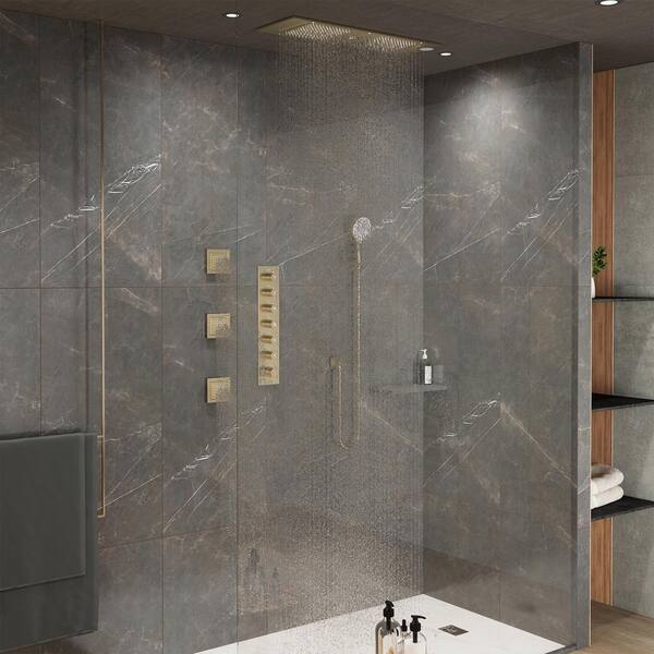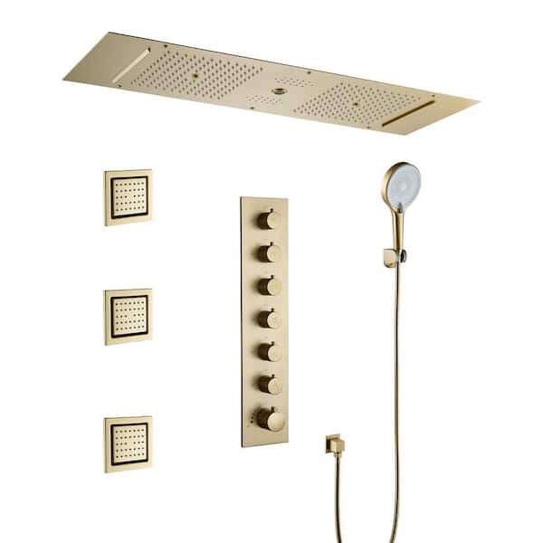 4-Spray Thermostatic Dual Shower Head Ceiling Mount Fixed and Handheld Shower Head 2.5GPM with Jet Spray in Brushed Gold