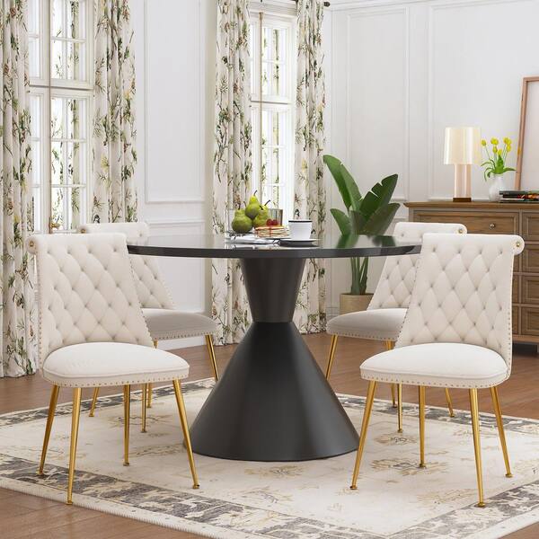 5-Piece Round Stainless Steel Black MDF Top Table Set Seats 4 (4 White Dining Chairs)