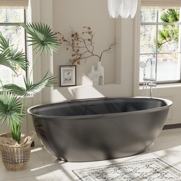 63 in. x 33 in. Solid Surface Stone Resin Freestanding Soaking Bathtub with Center Drain, Drainer, Hose in Matte Black