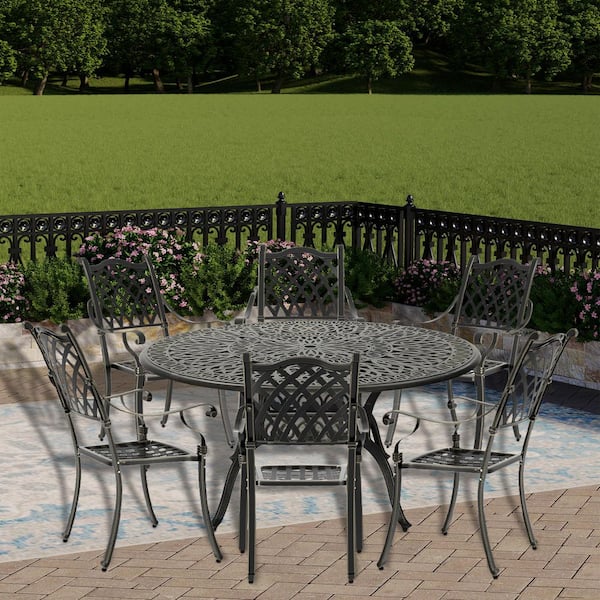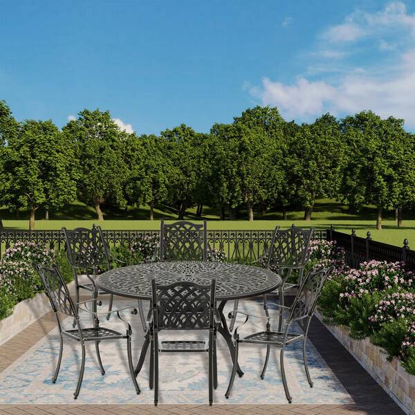 7-Piece Aluminum Outdoor Serving Round Dining Set in Bronze(1-Table and 6-Checkered Weave Chairs)