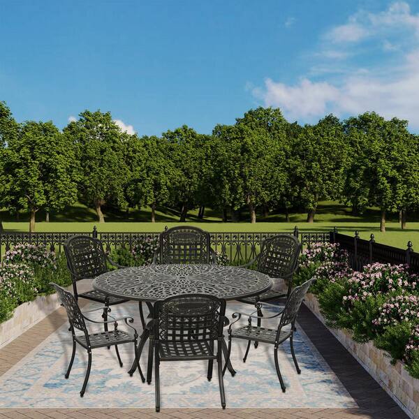 7-Piece Aluminum Outdoor Serving Round Dining Set in Bronze(1-Table and 6-Petals Backrest Chairs)