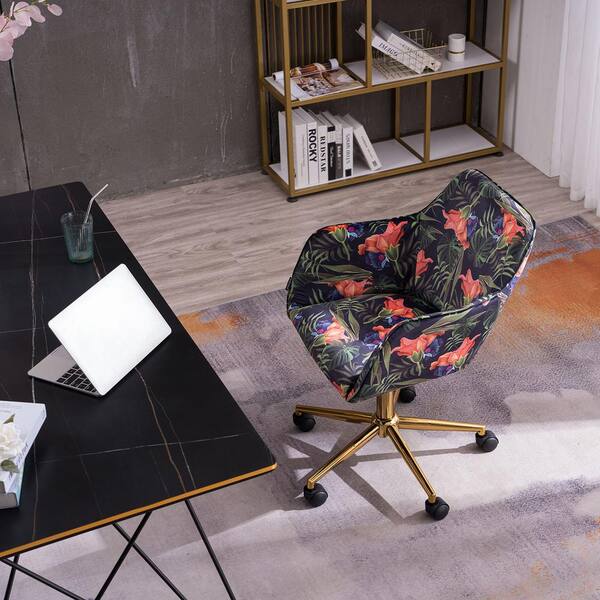 Chic Modern Gray Flower-Print Swivel Velvet Fabric Task Chairs with Adjustable Arms and 4 Gold Metal Legs