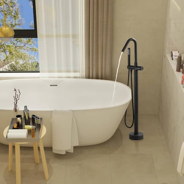 Modern Sleek Floor Mount Single-Handle Freestanding Tub Faucet with Hand Shower and Water Supply Hoses in. Matte Black