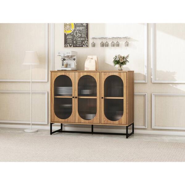 Natural 33 in. Storage Cabinet with Glass Door, Sideboard Buffet Cabinet for Kitchen, Dining Room, Walnut Color