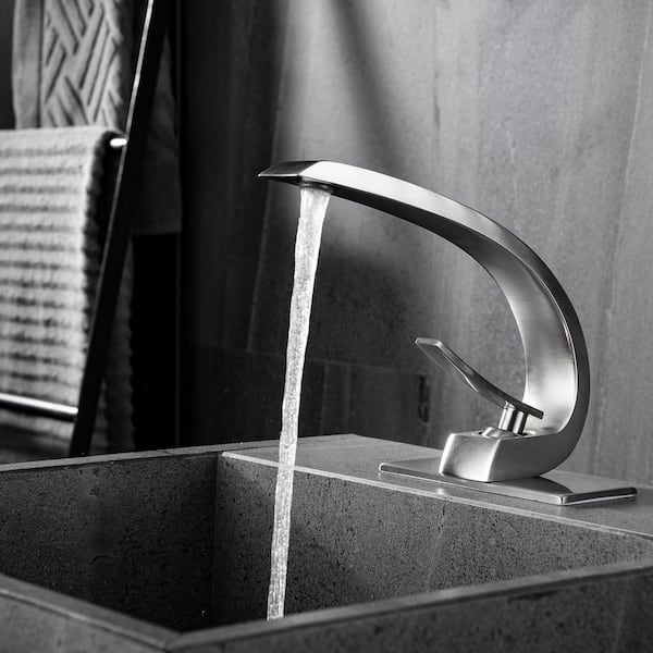 Single Hole 1-Handle Bathroom Faucet in Brushed Nickel with Deck Mount Lead-Free Solid Brass Arc Style Sink Faucet
