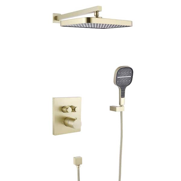 Thermostatic Shower 3-Spray 13 in. Dual Shower Head Wall Mount Fixed and Handheld Shower Head 1.8 GPM in Brushed Gold