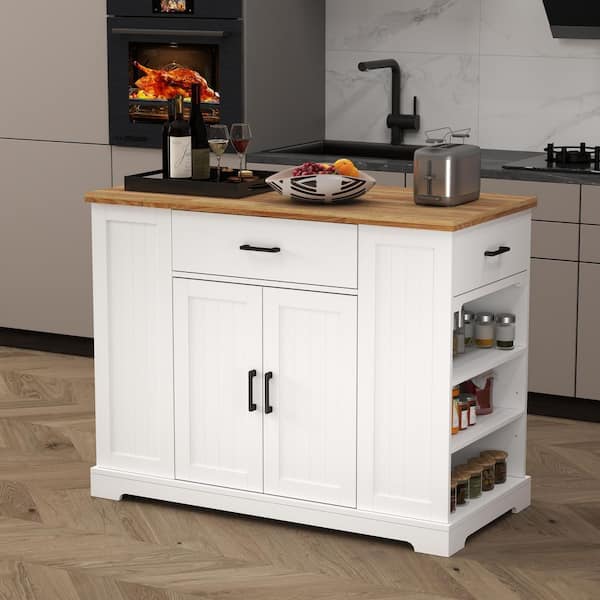 White Large Farmhouse Kitchen Cart with Adjustable Shelves and Drawers