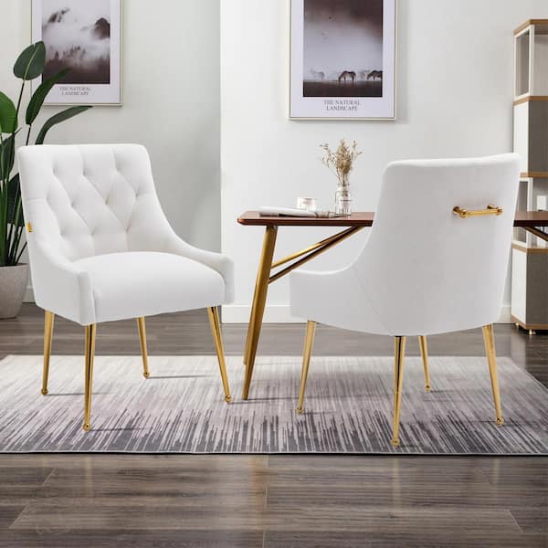 White Tufted Velvet Upholstered Golden Legs Dining Chair with Pulling Handle and Adjustable Foot Nails(Set of 2)