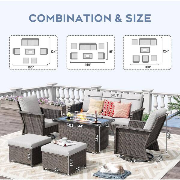 6-Piece Outdoor Patio Set with 44 in. Gas Fire Pit Table, Wicker Swivel Rocking Chairs and Cushions, Beige