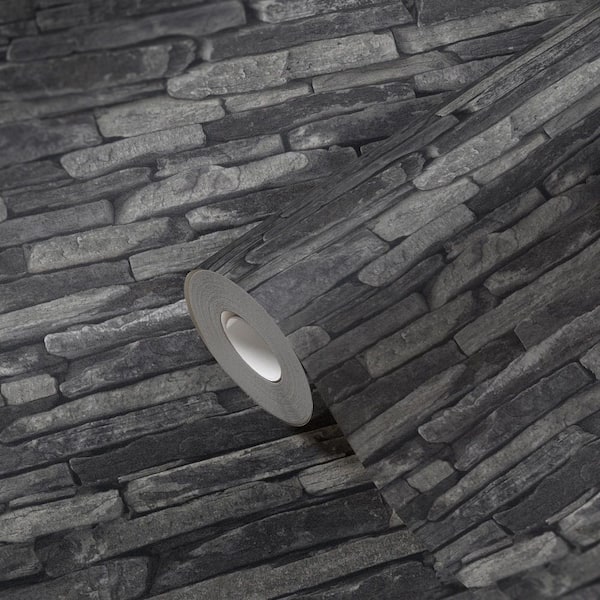 Bricks and More Collection Black Rocky Retreat Brick Matte Finish Vinyl on Non-Woven Non-Pasted Wallpaper Roll