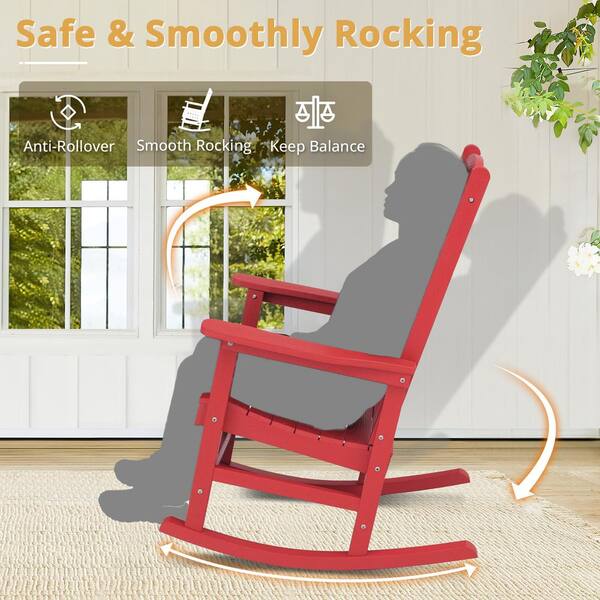 Bright Red Plastic Adirondack Outdoor Rocking Chair with High Back, Porch Rocker for Backyard