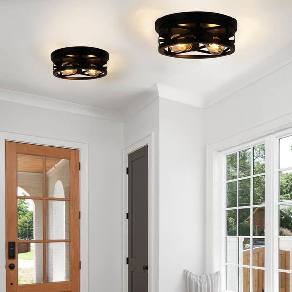 11 in.2-Light Black Flush Mount with Drum Metal Cage Shade for Entryway Bedroom (2-Pack)
