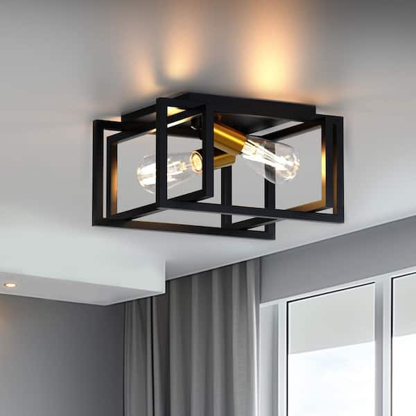 12 in. 2-Light Black and Gold Industrial Vintage Flush Mount Ceiling Light, Square Iron Frame, E26 Base, for Bedroom