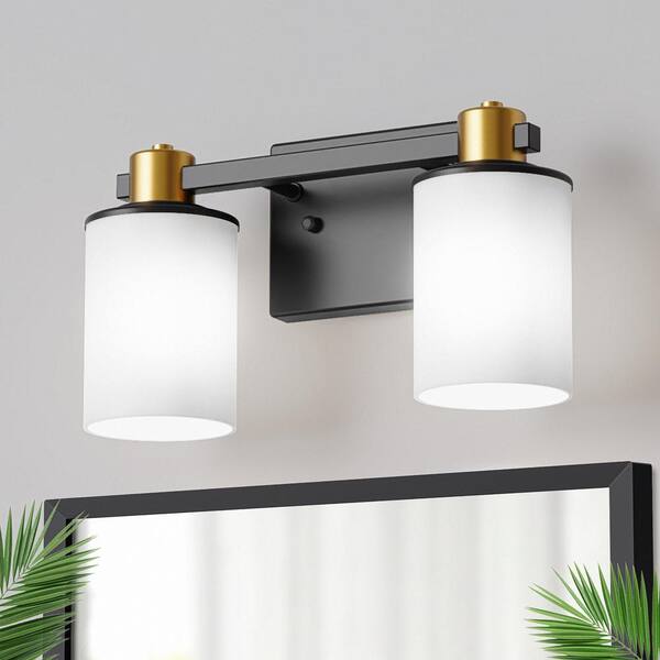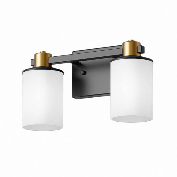 14 in. 2-Light Matte Black and Gold Bathroom Vanity Light for Hallway with Frosted Glass Shade Wall Sconce