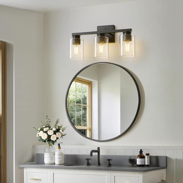 18 in. 3-Light Black Vanity Light with Cylinder Clear Glass Shades for Bathroom, Powder Room or Dressing Room