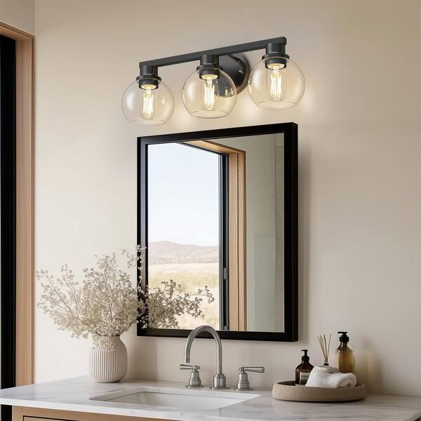 19 in. 3-Light Black Bathroom Vanity Light with Clear Globe Shades, LED Interior Lighting for Powder Room