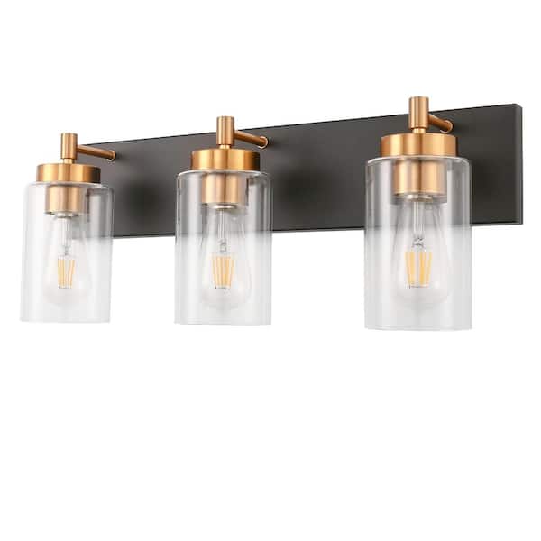 22 in. 3-Light Black Bathroom Vanity Light for Powder Room Kitchen with Clear Glass and Brass Socket