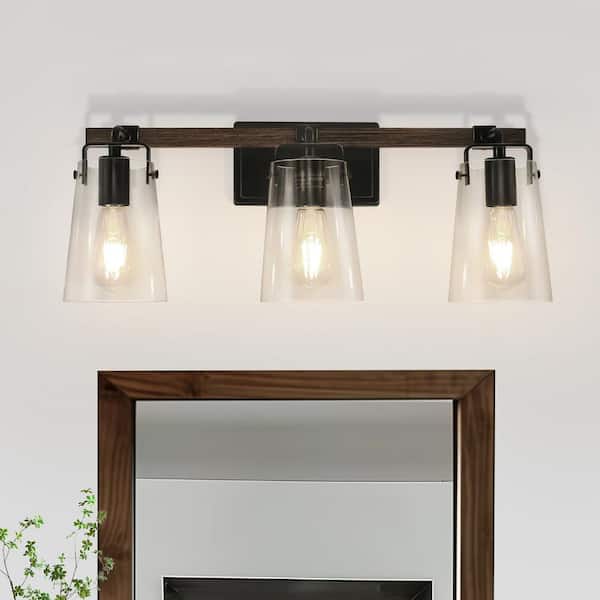 24.1 in. 3-Light Black and Wood Grain Clear Glass Vanity Light with Dimmable No Bulbs Included