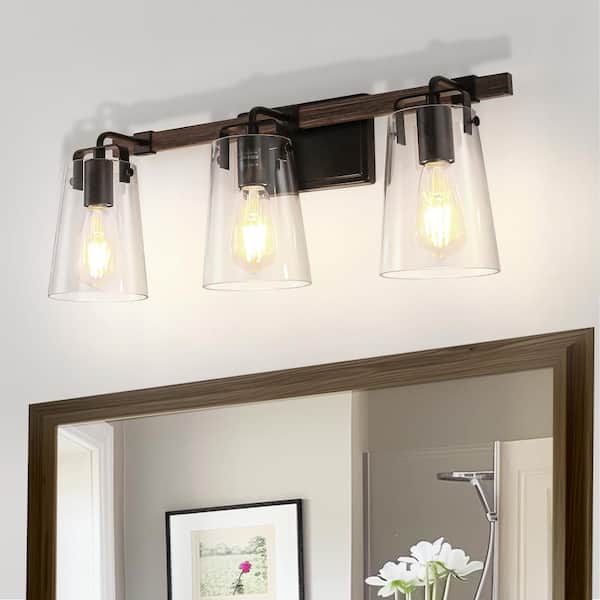 24.1 in. 3-Light Black and Wood Grain Metal Vanity Light with Dimmable No Bulbs Included