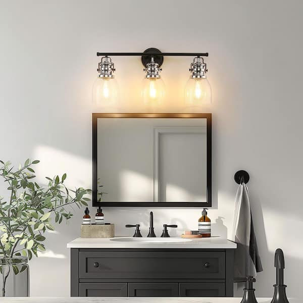 24 in. 3-Light Black and Nickel Modern Vanity Light with Clear Glass Bell Shades for Bathroom Mirror