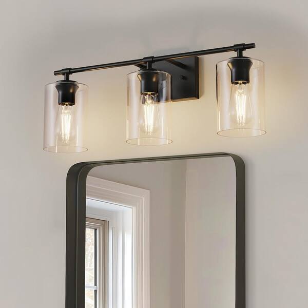 24 in. 3-Light Matte Black Cylinder Vanity Light with Clear Glass Shade for Bathroom Multi Mounting Positions