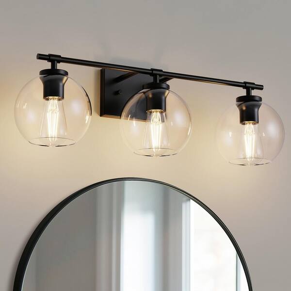 25 in. 3-Light Matte Black Vanity Light with Globe Clear Glass Shade for Bathroom Multi Mounting Positions