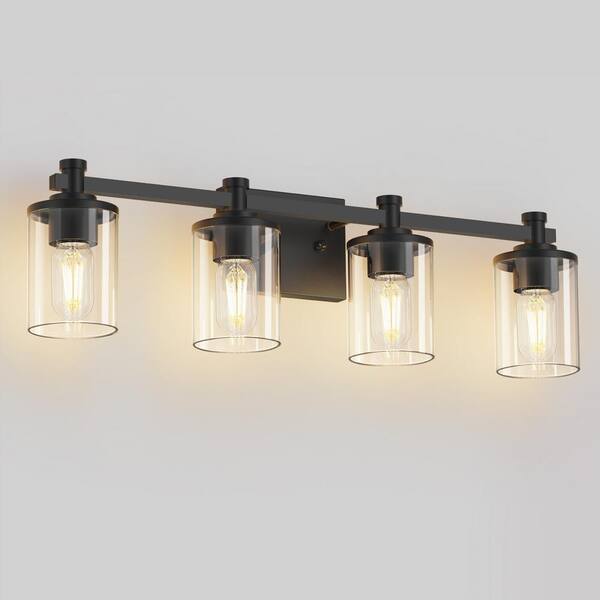 28 in. 4-Light Modern Matte Black Industrial Vanity Light with Clear Cylinder Glass Shades for Bathrooms