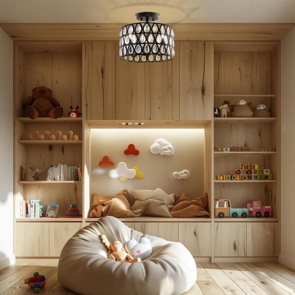 3-Light Matte Black Semi-Flush Mount Ceiling Light with Teardrop Crystals, E12 Base, No Bulbs Included