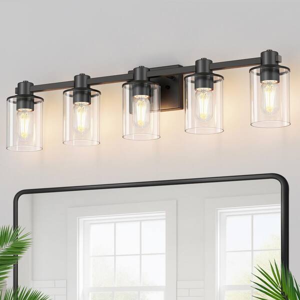 32 in. 5-Light Black Metal Vanity Light with Clear Glass Shade and No Bulbs Included